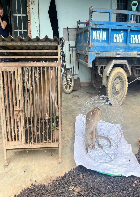 Hình ảnh Kiểm lâm viên Hạt Kiểm lâm Đức Lập chụp trong quá trình tiếp nhận 02 cá thể khỉ tại nhà bà Mai Thị Thêm