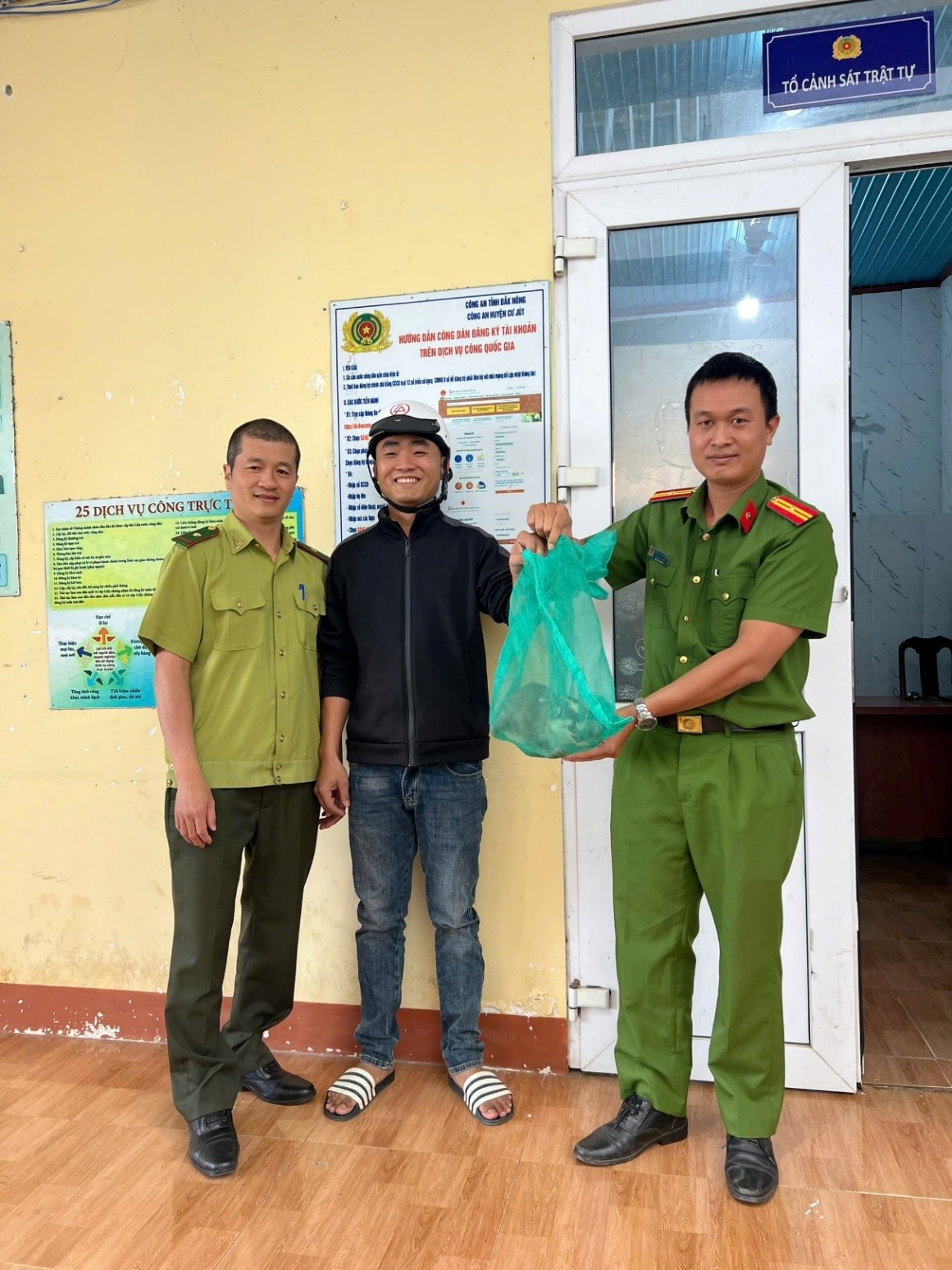 Hình ảnh người dân tự nguyện giao nộp Chồn bạc má cho cơ quan chức năng có thẩm quyền (Hạt Kiểm lâm Đức Lập phối hợp UBND xã Nam Dong, Công an xã Nam Dong tiếp nhận, phối hợp quản lý, chăm sóc và hoàn thiện các thủ tục theo quy định pháp luật)
